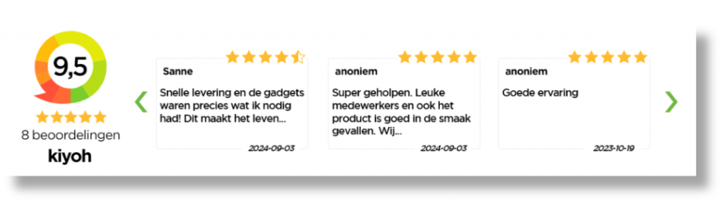 Er zijn verschillende manieren om je review score offline terug te laten komen, denk bijvoorbeeld aan een baliestandaard, auto- of deursticker, poster of andere offline promotiemiddelen. Zo zien je (potentiële) klanten ook in je showroom, winkel, wachtruimte en dergelijke hoe je wordt beoordeeld en overtuig je ze hiermee om voor jou te kiezen!