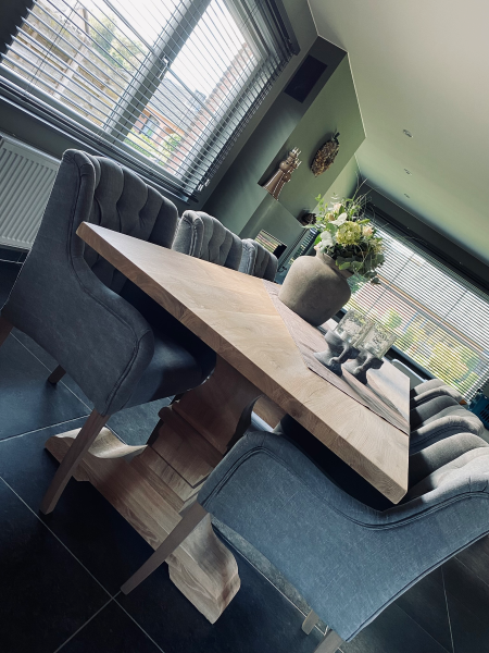 Super mooie tafel . Maar erg spijtig dat de voet niet als op de foto was in zwart. Dat grijs met al wat roest keur was niet passende op de tafelblad. Hebben dan maar de voet laten behandelen en in zwart laten kleuren